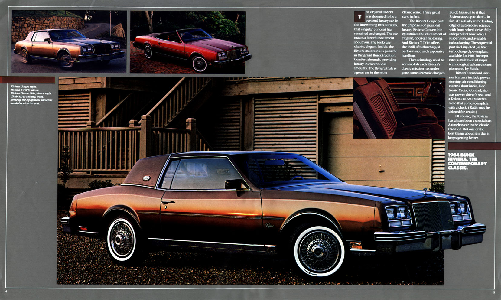 Standard exterior and mechanical features on all 1984 Rivieras included a four-speed automatic transmission, power steering, power brakes, and power antenna. Inside, every Riviera had air conditioning, power door locks, and power windows.