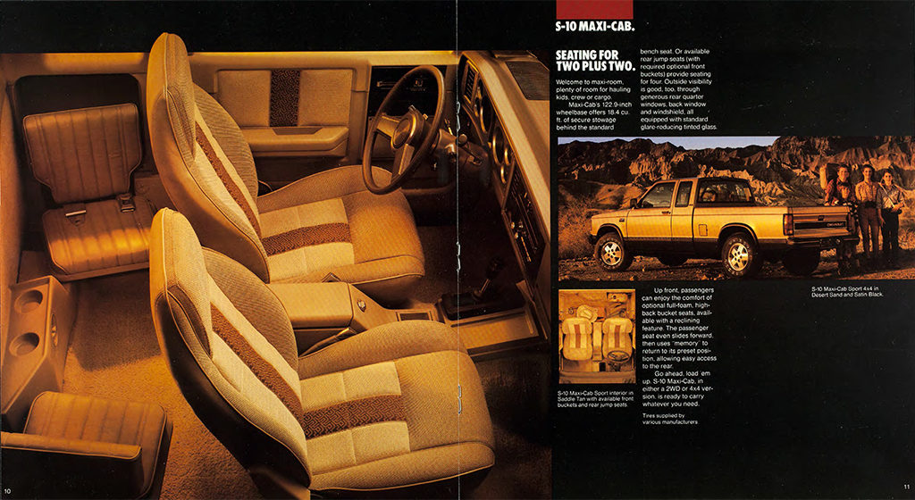 Standard equipment on the base $5,990 S-10 (about $18,500 in 2025 dollars) was pretty spare. Still, it included P195/75R14 all-season steel-belted radial tires on 14 x 6 inch painted argent wheels with bright metal hub caps, a color-keyed instrument panel, an upshift light, a locking stowage box, a full headliner, and a vinyl bench seat. At $7,167 (about $22,100 in today’s dollars), all Maxi-Cab S-10s included tinted glass, vacuum power brakes, and a dome lamp. 4WD versions of the Maxi-Cab included a front stabilizer bar and P195/75R15 tires on 15 x 6 inch wheels.