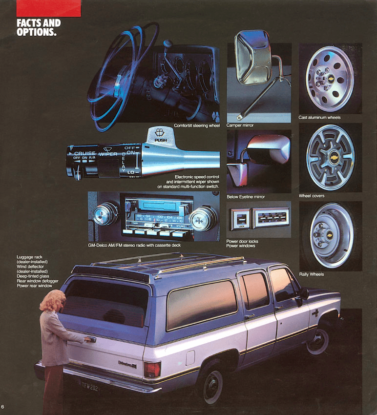 Beyond the trims, the 1985 Suburban’s options list was long and complicated. Suburban buyers first had to choose whether they wanted panel rear doors (standard) or a tailgate with manual drop glass ($36). Next came seating choices: front seat only, front seat and folding center seat, or front seat, folding center seat, and removable rear seat.