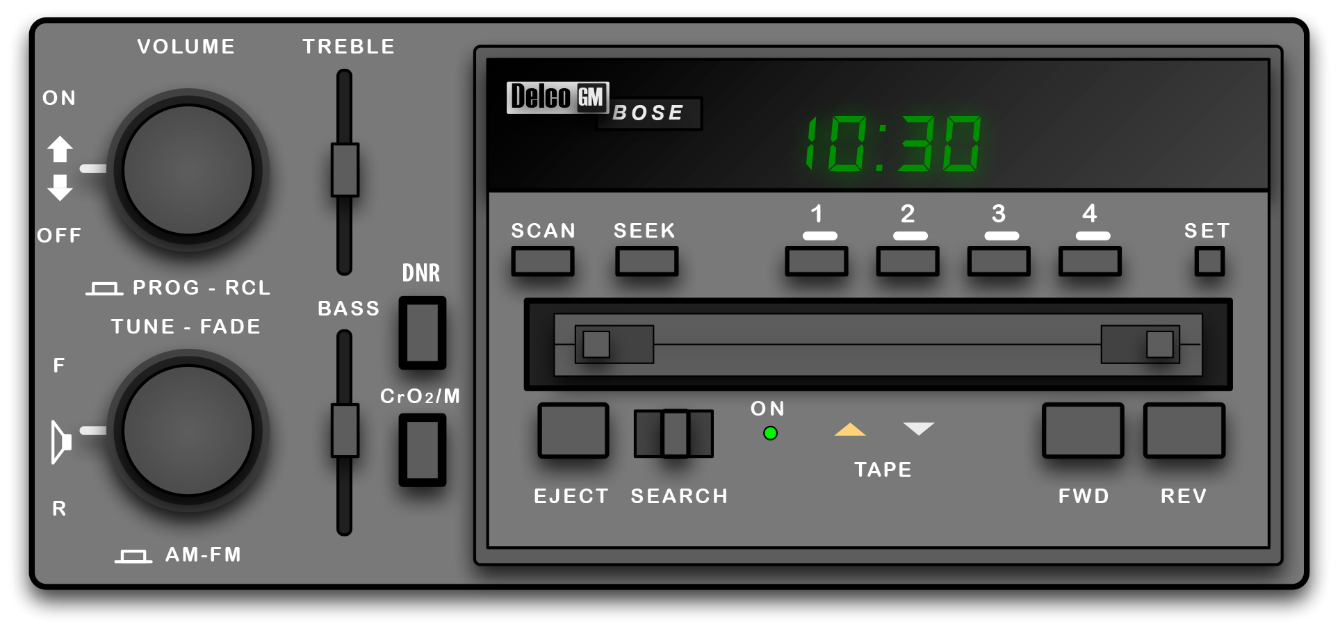 The Bose’s two main differentiators were excellent sound imaging for the two front passengers and individual equalization for each of the four speakers, each with its own 25-watt amplifier. The system’s head unit looked basic, with fewer controls than some lesser Delco systems—something not typical in the 1980s, where higher-end systems (either in the home or auto) usually had more buttons, dials, and sliders. There was no balance control (having one would mess with what Bose saw as the all-important imaging) and no graphic equalizer.