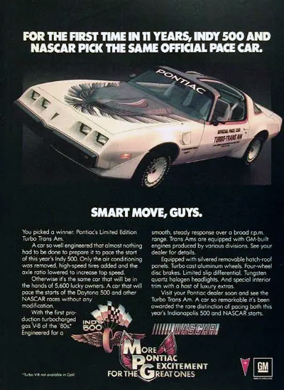 There was also a special edition of the Special Edition in completely different colors—the Indianapolis Pace Car Edition. The Indianapolis Pace Car Edition was Cameo White, with Soft Ray tinted glass on all windows, white Turbo cast aluminum wheels, silver T-tops, and oyster interior trim. Mechanical features included the LU8 turbocharged engine, turbo boost gauges, the WS6 special performance package, and four-wheel power disc brakes. Inside, a leather-wrapped steering wheel, Custom air conditioning, and a Delco-GM ETR AM/FM radio with a cassette player were included. All this extra content was a good thing because the Indianapolis Pace Car Edition listed for $11,020.52 (why not just round to the closest dollar?)—about $47,500 in 2025 dollars. After initially promising 5,600 in advertising, Pontiac ended up building 5,700, about 11% of 1980 Trans Am production.