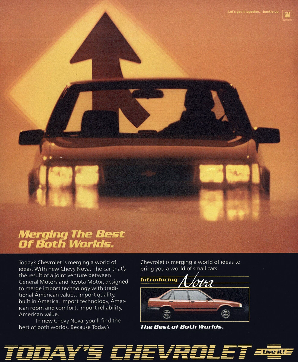 The new Nova was a rebadged and mildly restyled version of the Japanese market Toyota Sprinter, itself a model sold in Japan as a badge-engineered version of the Toyota Corolla. The pre-existing design was chosen over a clean-sheet approach because it could be brought to market more quickly.
